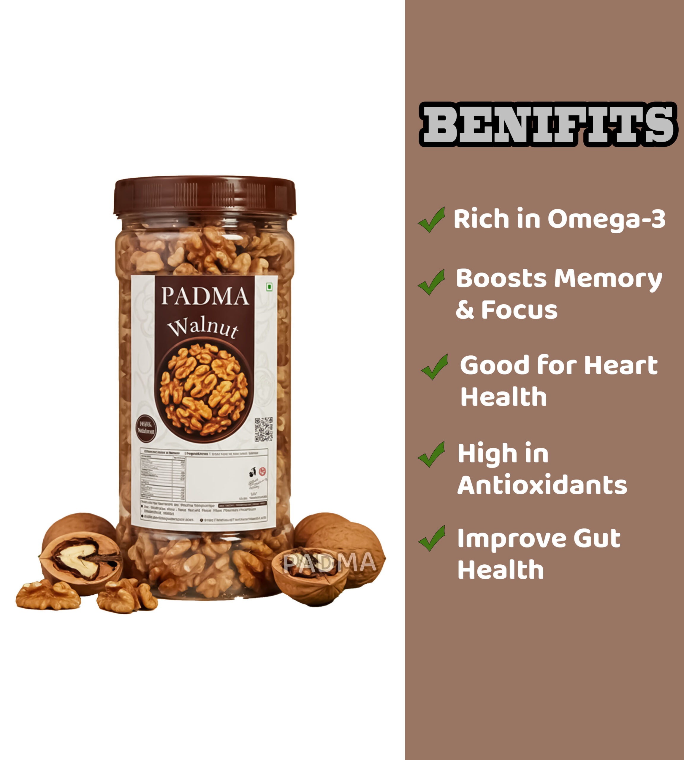 Padma Walnuts are carefully selected for superior quality and taste. Rich in omega-3 fatty acids, antioxidants, and vitamins, these crunchy nuts are perfect for snacking or adding to desserts.